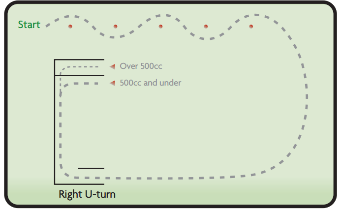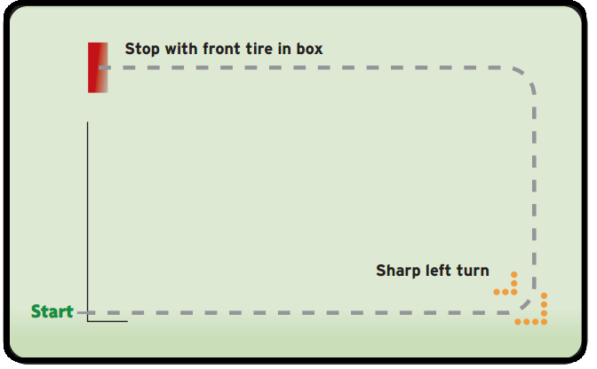 Start from stop. Once the instructor gives you the signal you proceed to ride at any speed you feel comfortable in. You will maneuver the motorcycle through a sharp left turn without touching the boundary lines. Following another left turn you will meet a straightaway and be expected to come to a smooth, slow stop with your front tire in the box. Skidding is not allowed for this test and can count against you.