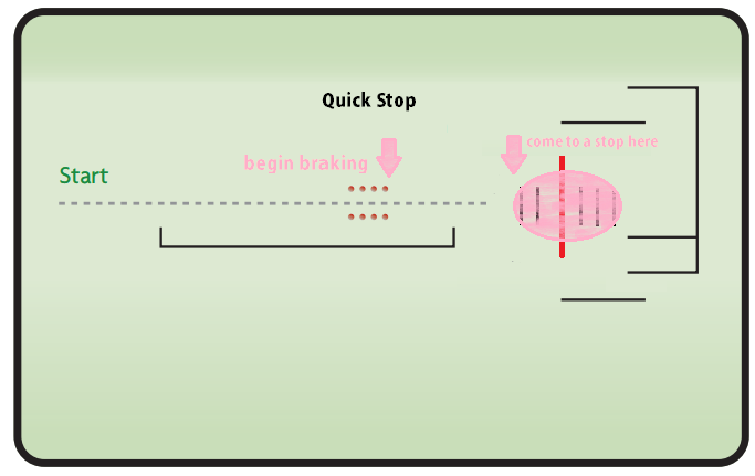 Start from a stop. Once instructor gives you the signal, you take off going between12–20mph. At the first arrow, there will be two cones on either side where you will let go of the gas and begin braking quickly. The goal here is to be able to come to a quick, smooth stop within the outlined circle without losing control of the motorcycle. Skidding is allowed in this test and does not count against you.