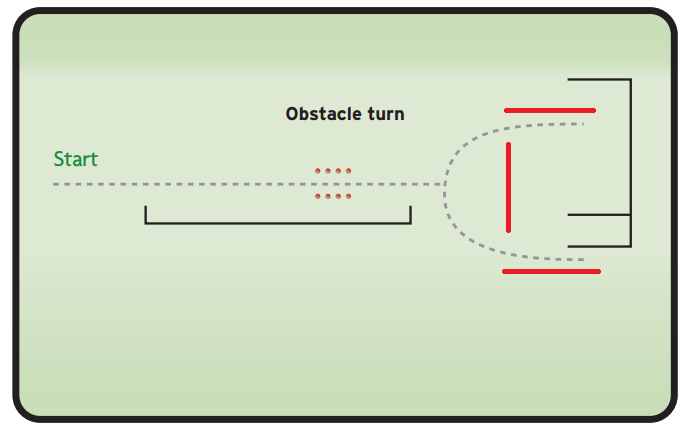 The fourth and final test is similar to test3, but instead of stopping as soon as you can, you have to avoid the red line by swerving around it. The instructor will let you know in which direction to swerve before taking off from the starting position. The object of this test is to see if you can avoid an obstacle at a set speed while staying within the boundary red lines on either side of the horizontal.